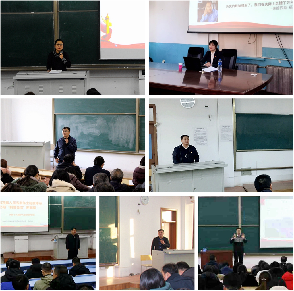 12月9日,校党委宣传部发出了《关于开展党的十九届四中全会精神宣讲的通知》,组建我校“十九届四中全会精神理论宣讲团”,对全校各党委、直属党支部集中宣讲工作作出部署和安排。12月11日以来,我校“党的十九届四中全会精神理论宣讲团”7名专家深入各基层学院,集中开展全会精神专题宣讲活动14场,不断推动全会精神学习走实走深。