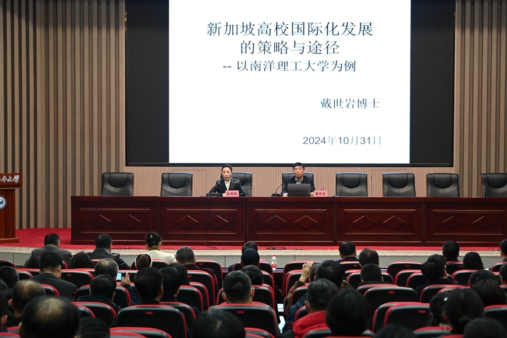 为进一步深化国际化办学理念,提升国际化办学意识,提高学校国际化办学水平,10月31日上午,新加坡南洋理工大学戴世岩博士应邀来我校,在日新大厦四楼学术报告厅作了题为《新加坡高校国际化发展的策略与途径--以南洋理工大学为例》专题讲座。校长郝文斌、副校长张树军出席讲座,全校副处级以上干部、各学科专业带头人、系主任等近200名教职工参加讲座。讲座由国际教育学院院长赵璐璐主持。