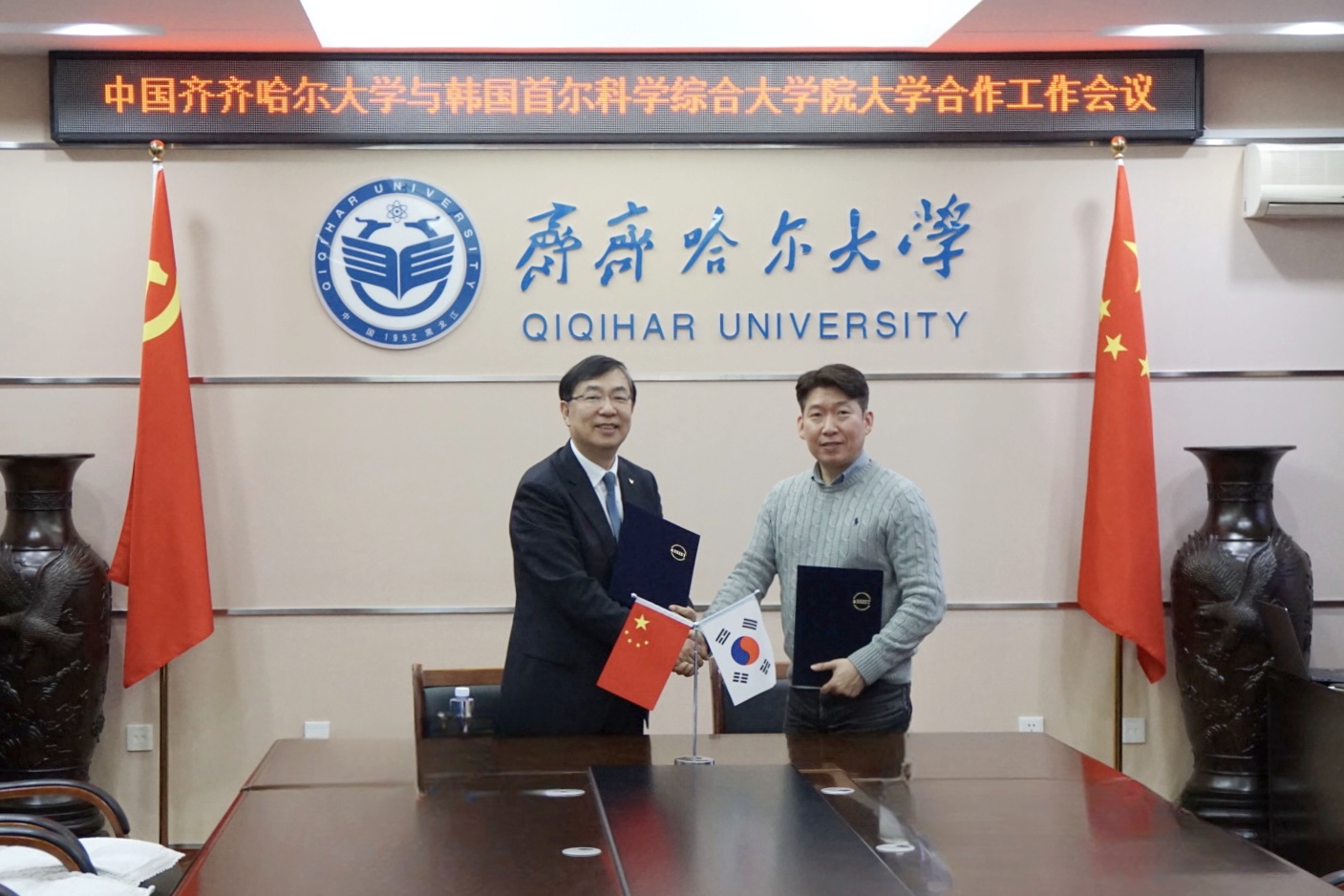 郝文斌与尹成日代表双方签署合作交流协议。