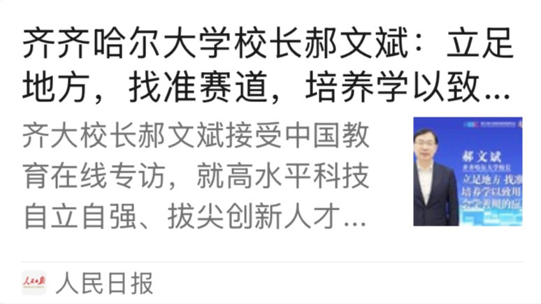 11月15日至17日,由中国高等教育学会主办,重庆市教育委员会、重庆大学等单位承办的第62届中国高等教育博览会在重庆国际博览中心举行。在参加会议期间,我校校长郝文斌接受了中国高等教育学会联合中国教育在线推出的《高教前沿》系列访谈栏目专访。郝文斌以《立足地方,找准赛道,培养学以致用、会学善用的应用型人才》为题,主要就高水平科技自立自强、拔尖创新人才培养、人工智能对教育的挑战等问题分享了观点。采访报道得到中宣部“学习强国”平台、“人民日报”人民号、中国教育在线等平台专题刊发。