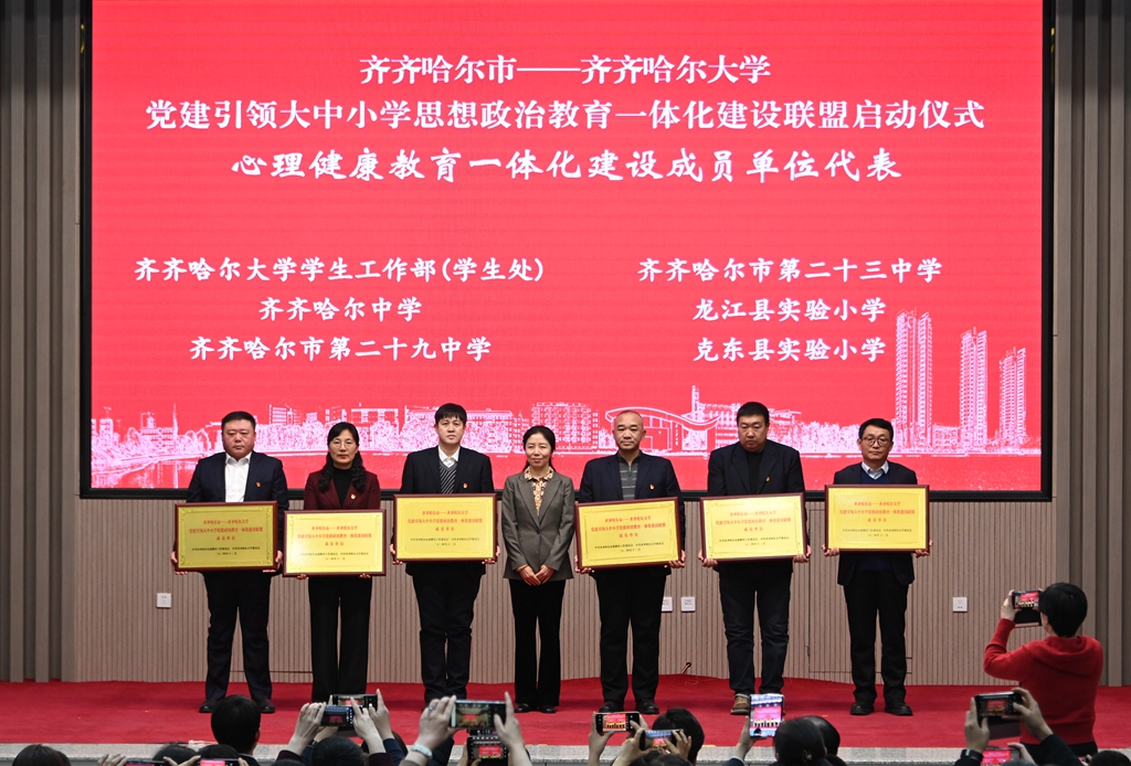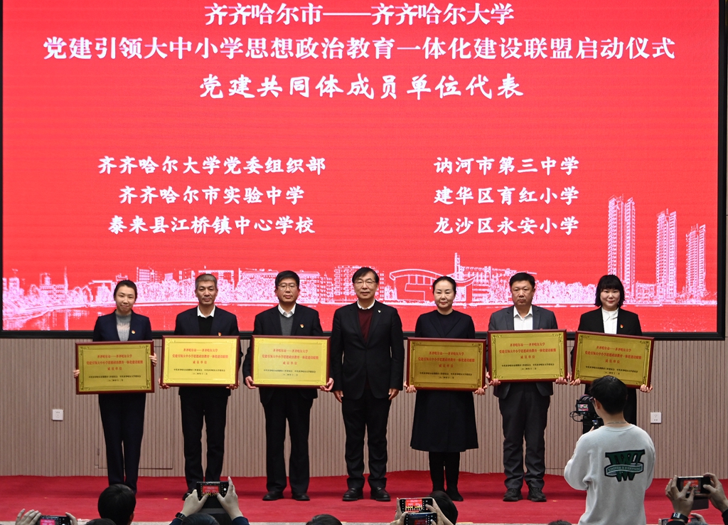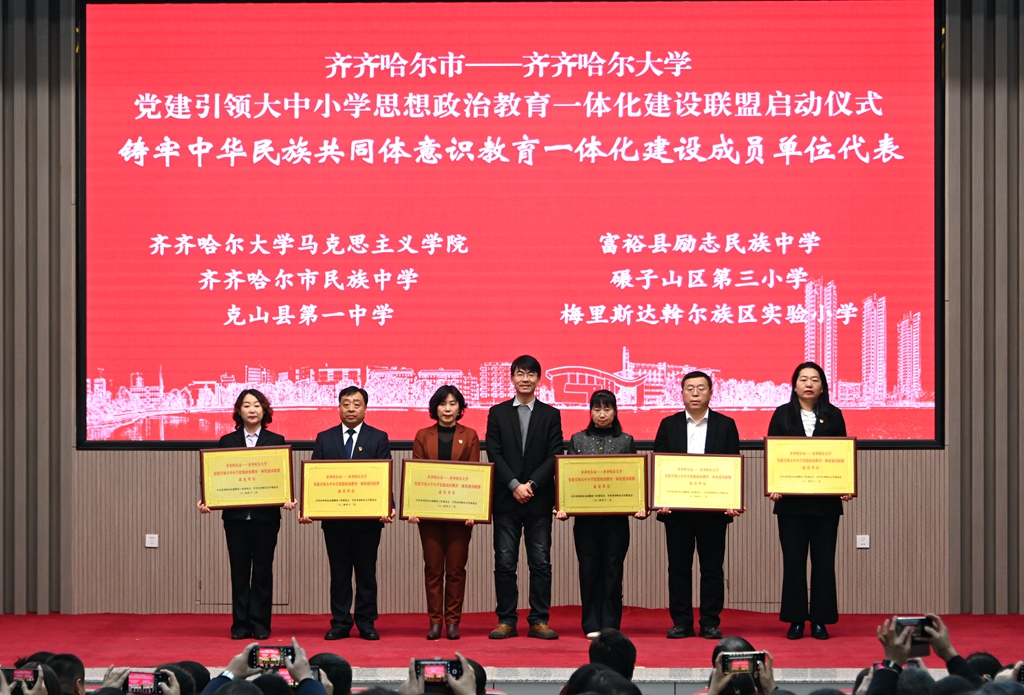 与会领导分别为“齐齐哈尔市—hg0022体育皇冠地址党建引领大中小学思想政治教育一体化建设联盟”成员单位代表授牌。