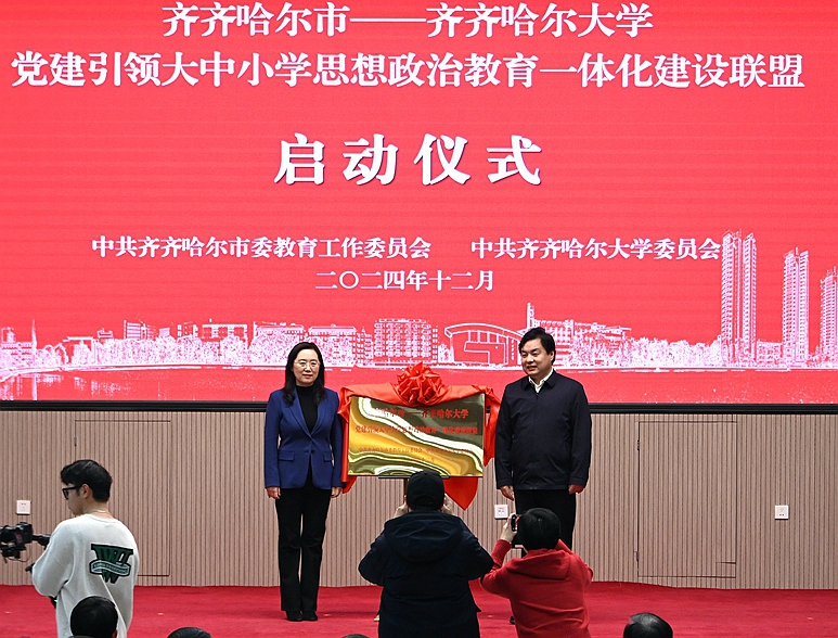 刘振江和丁宏一起为“齐齐哈尔市-hg0022体育皇冠地址党建引领大中小学思想政治教育一体化建设联盟”揭牌。