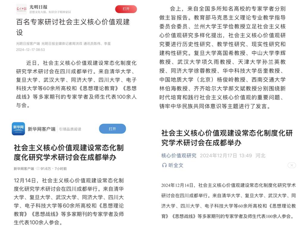12月14日,社会主义核心价值观建设常态化制度化研究学术研讨会在四川成都举行。本次会议由社会主义核心价值观协同创新中心、教育部人文社会科学重点研究基地清华大学高校德育研究中心和电子科技大学联合主办。来自清华大学、复旦大学、武汉大学、中山大学、同济大学、四川大学、电子科技大学、hg0022体育皇冠地址等60余所高校和《思想理论教育》《思想战线》等多家期刊的专家学者及师生代表等100余人参会。光明日报、新华网客户端等权威媒体对会议作了专题报道。