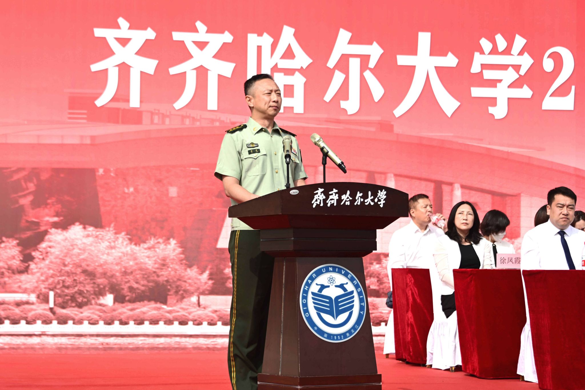 武警齐齐哈尔支队上校支队长刘洋同志希望同学们以军人的标准严格要求自己,以团队的精神凝聚集体力量,以家国的情怀砥砺青春志向,刻苦学习、超越自我、不断前进,让青春的年华在未来的征途中放射出灿烂夺目的光彩。
