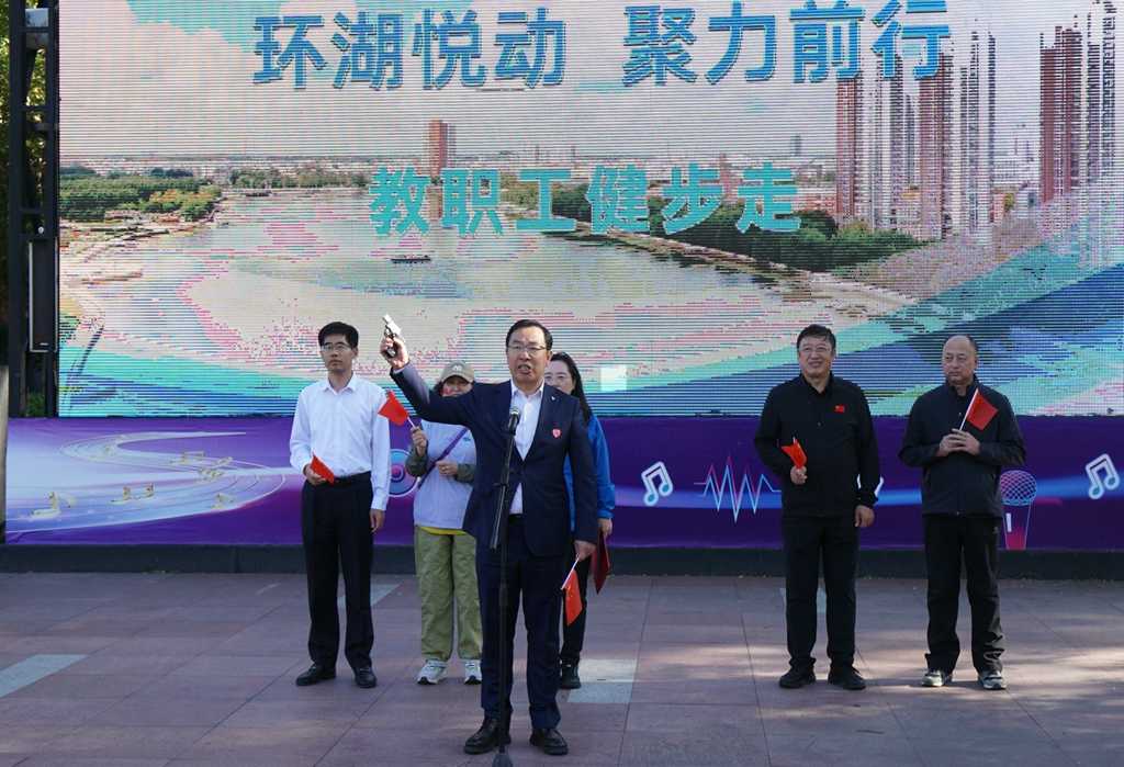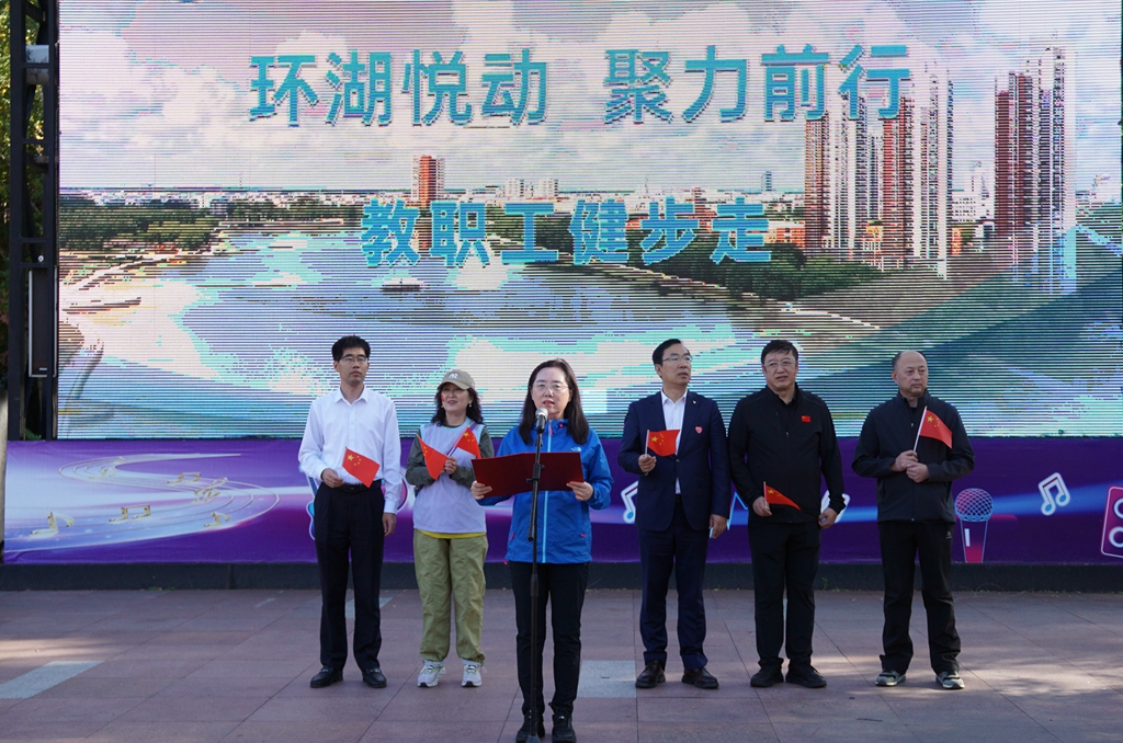 校党委书记丁宏在致辞时代表学校向辛勤耕耘在教学、科研、管理服务一线的全体教职工致以诚挚问候。她指出,学校环劳动湖而建,“环湖大学”的美誉深入人心。教职工环湖健步走活动作为学校的特色品牌活动,既体现了学校对教职工身心健康的关心关爱,也展现了齐大人团结奋进的精神风貌。当前学校正处于教育教学审核评估的关键时期,面临着服务龙江全面振兴、推进学科建设、提升育人质量的新任务新挑战。希望全体教职工把徒步中收获的活力与激情,转化为教书育人、干事创业的动力;把活动中凝聚的团结与共识,转化为推动学校发展的强大合力。