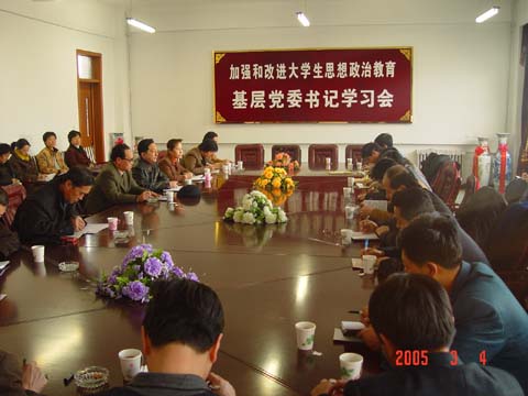 学工部(处)长王刚传达了《胡锦涛同志在全国加强和改进大学生思想政治教育工作会议上的讲话》、宣传部副部长田志峰传达了《李长春同志在全国加强和改进大学生思想政治教育工作会议上的讲话》和《陈至立同志在全国加强和改进大学生思想政治教育工作会议上的讲话》。校党委书记陈承贵主持了会议。