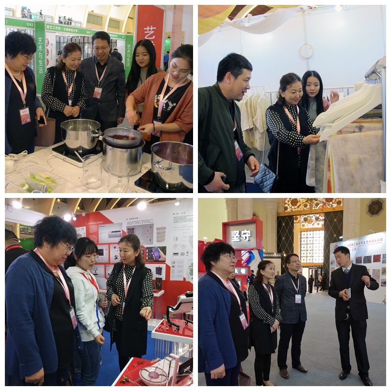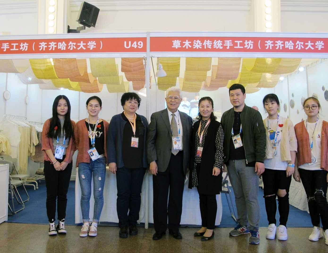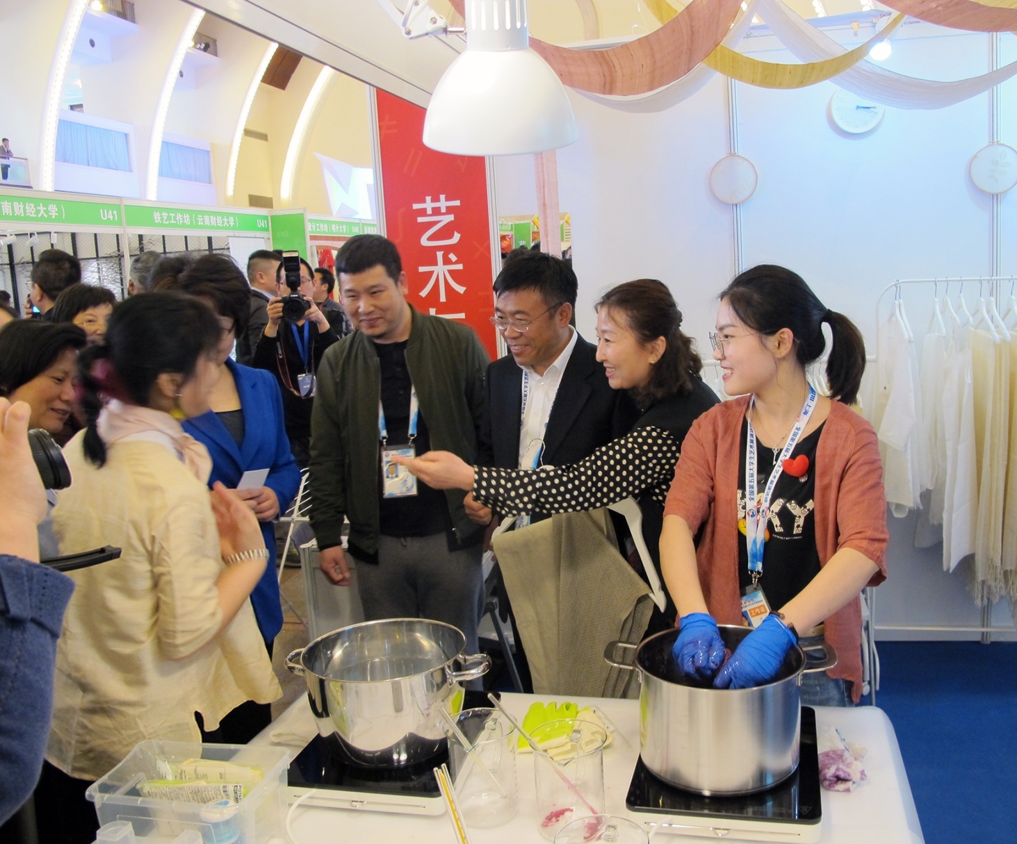 草木染传统工作坊是在“文化铸校”科学理念指导下我校大学生研发创新团队于2012年建立的。该团队主要由hg0022体育皇冠地址美术与艺术设计学院副院长范铁明教授、服装与服饰设计系赵志军副教授等组成,团队多年来以中国传统染色技艺为基础,利用现代科技手段进行技术改良和创新。通过建立大数据标准色卡数据库系统,对纺织品的颜色特征进行大胆的艺术创新实践。以全产业链整合连锁、生物酶高效生化色素萃取、大数据标准色卡数据库系统、分子生物学复合改性与表征、传统技艺现代仿真为创新点,在天然染料方面为消费者提供安全环保的纺织物。通过多年的技艺革新与大量的创新实践,目前已经形成了成熟的草木染技艺。2017年6月,草木染团队参加第十五届“挑战杯”黑龙江省大学生课外学术科技作品竞赛决赛,荣获一等奖、最具市场潜力奖、最佳人气作品奖三个奖项。2017年8月,该团队获得黑龙江省第五届大学生艺术展演(艺术工作坊)二等奖。同年5月和8月,草木染研发创新团队先后参加深圳文博会和第十二届黑龙江国际文化产业博览会,并顺利与企业签约进行全产业链合作。此次借助大艺展的平台,我校的草木染传统手工坊进一步走出黑龙江省,走向了全国,让更多的人熟悉和喜爱,所有参演师生都充满欣喜,倍感振奋。而欣喜与振奋之余,通过与全国各参展单位的交流,参演师生有了更多更深的思考,就是在新时代如何将草木染的成果更快更好地与现实生活紧密结合,不断满足日益增长的美好生活需要。更新发展理念,开拓审美视野,增长技艺见识,扩大友好交流,此次大艺展使hg0022体育皇冠地址参展师生收获颇丰。