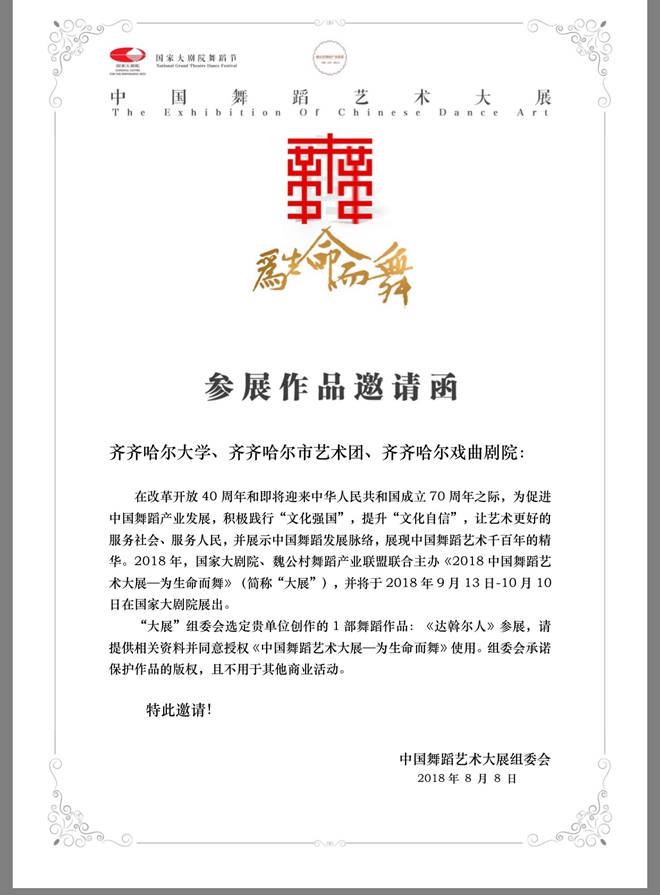在改革开放40周年和即将迎来中华人民共和国成立70周年之际,为促进中国舞蹈产业发展,积极践行“文化强国”,提升“文化自信”,展现中国舞蹈艺术千百年的精华,2018年9月13日-10月10日,由国家大剧院、魏公村舞蹈产业联盟联合主办的《2018中国舞蹈艺术大展—为生命而舞》,在国家大剧院展出。大展组委会选定由hg0022体育皇冠地址和齐齐哈尔市戏曲剧院联合打造的大型风情音画《达斡尔人》参展。