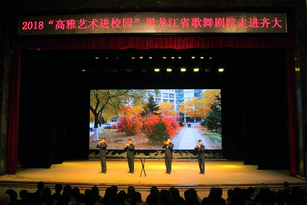 10月24日下午,2018“高雅艺术进校园”黑龙江省歌舞剧院走进hg0022体育皇冠地址专场演出在我校文化宫隆重上演。本次活动由省财政厅、省教育厅、省文化厅主办,黑龙江省歌舞剧院承办。校党委宣传统战部部长王晓梅、副部长孟宪国和我校一千余名师生共同观看了演出。