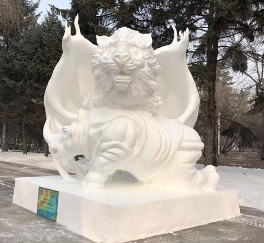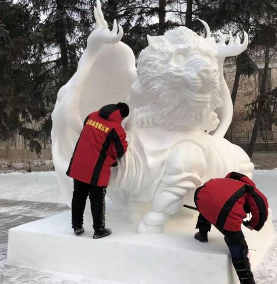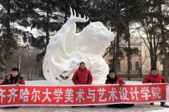 美术与艺术设计学院代表队师生们克服困难,每天从早7点到晚8点在极度低温的雪场中进行创作,身体及心理上都经受了巨大考验,最终取得了骄人成绩。他们创作的作品《如虎添翼》表现了一只狮鹫兽伏趴在犀牛背上,仿佛即将要展翅腾空,表达出面对困难无畏艰险、一往无前的精神。
