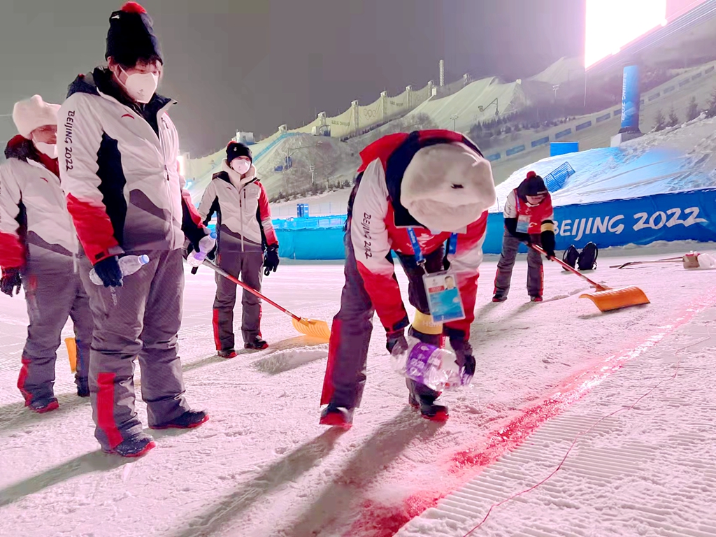 为确保赛事的顺利进行,裁判员需要每天早上5点天没亮就出发到赛场进行场地清除浮雪、场地平整、旗门设计、场地划线、终点线绘制、终点混合区设置等工作。障碍追逐国内裁判团队还成立了临时党支部,充分发挥党员的先锋模范作用和党组织的战斗堡垒作用,为高质量完成赛事工作保驾护航。每一位裁判员在坚守各自岗位,出色完成执裁任务的同时,都会帮助其他岗位完成工作,在大家眼里工作不分组别,参加冬奥会就是贡献力量,就是要向世界展示中国裁判员的执裁技能、工作作风和精神风貌。