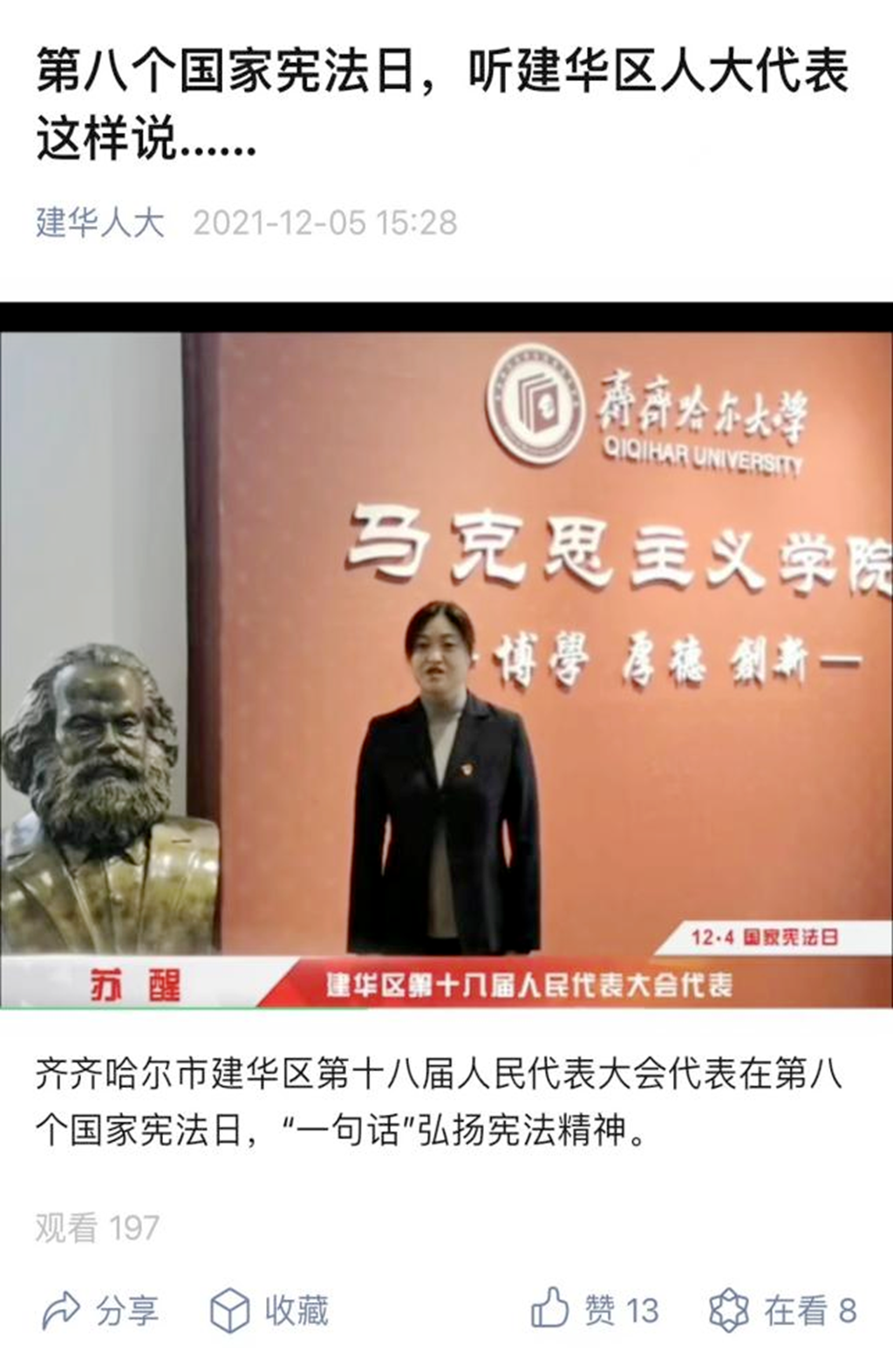 马克思主义学院党委书记苏醒作为建华区人大代表,带头学习习近平法治思想,积极进行“国家宪法日”宣传。