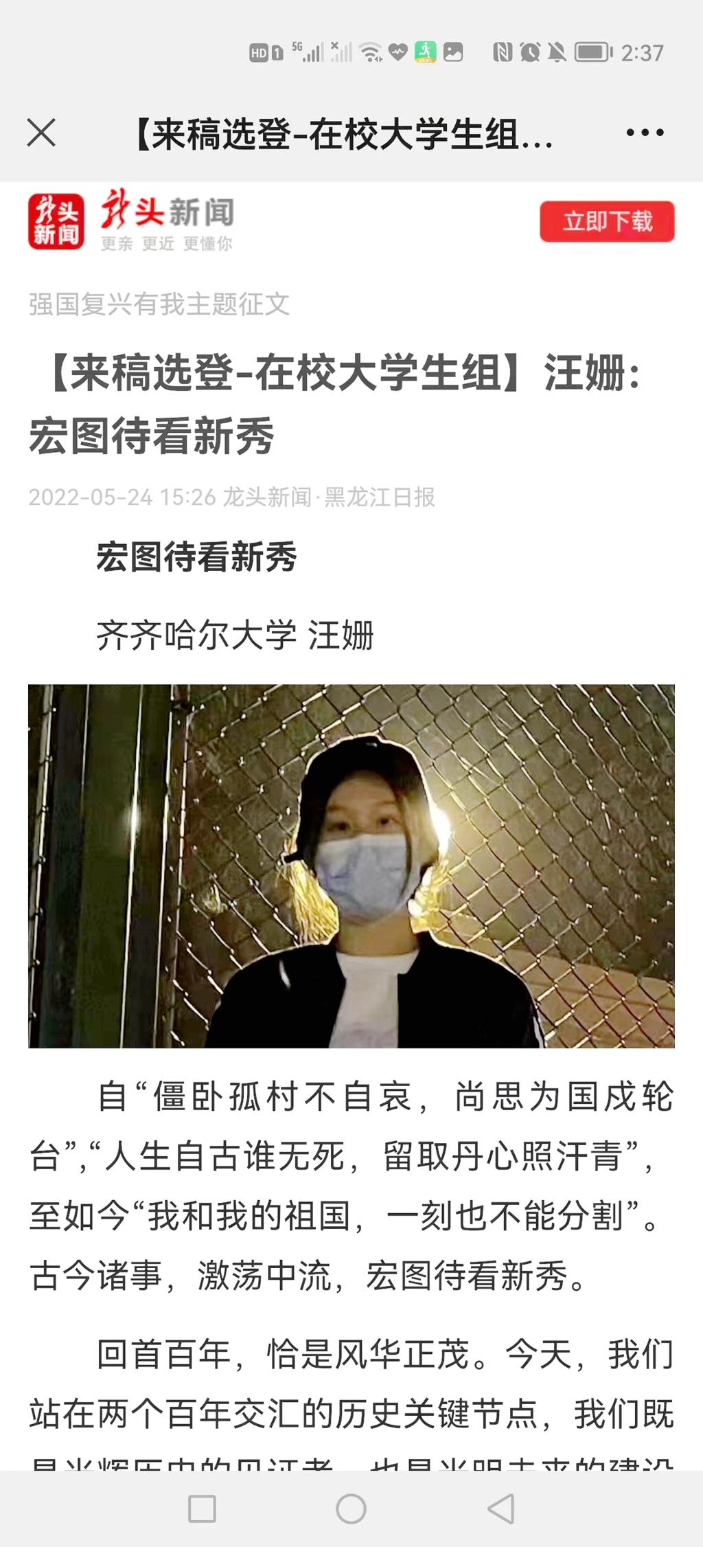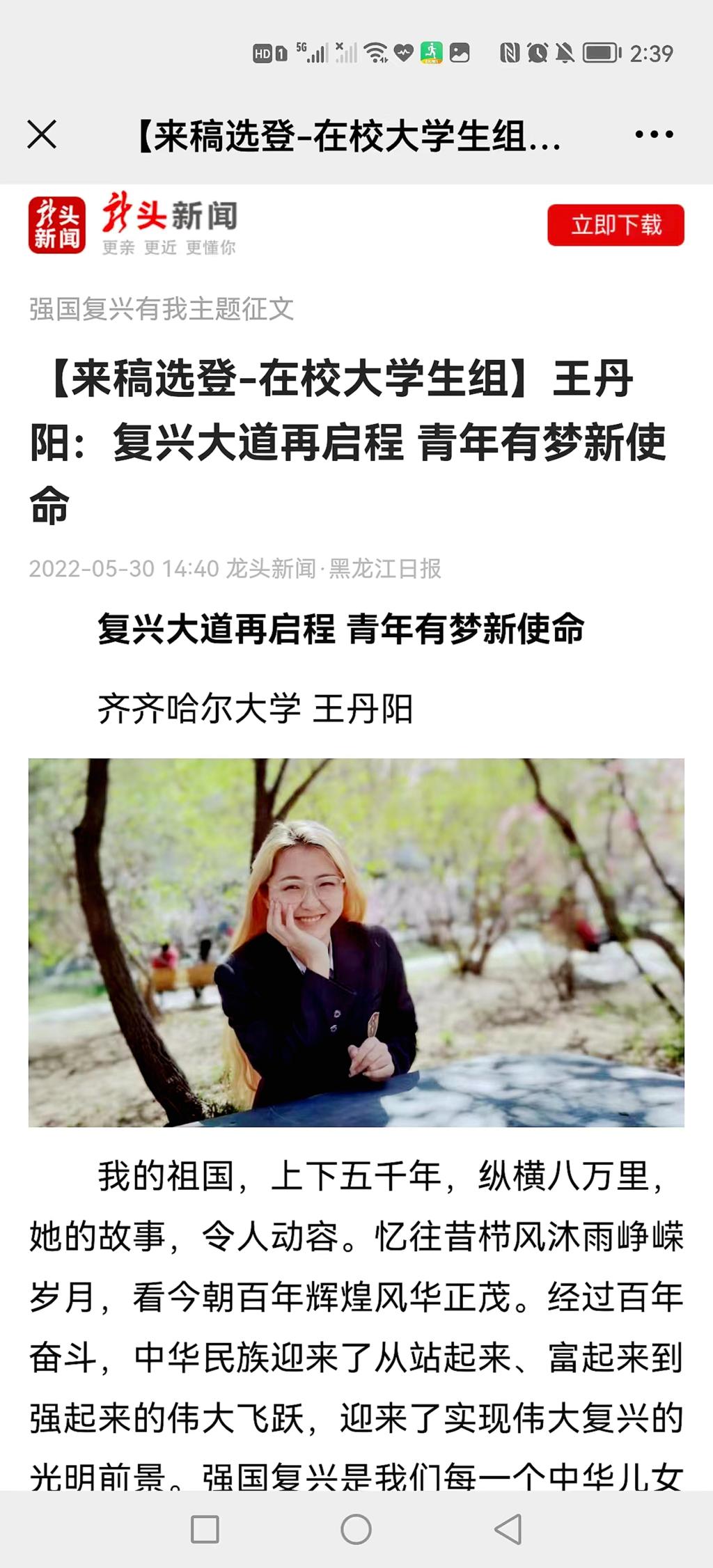 近日,由省委宣传部、省直机关工委、省委教育工委联合主办,黑龙江日报报业集团承办的黑龙江省“强国复兴有我”主题征文活动,已完成评选工作,中小学生组、在校大学生组、社会组、省直机关组四个组别已分别评出一二三等奖和优秀奖。我校共有4名师生荣获奖项,其中在校大学生组二等奖1人(全省2名)、优秀奖2人(全省15名),社会组优秀奖1人(全省15名),具体情况如下: