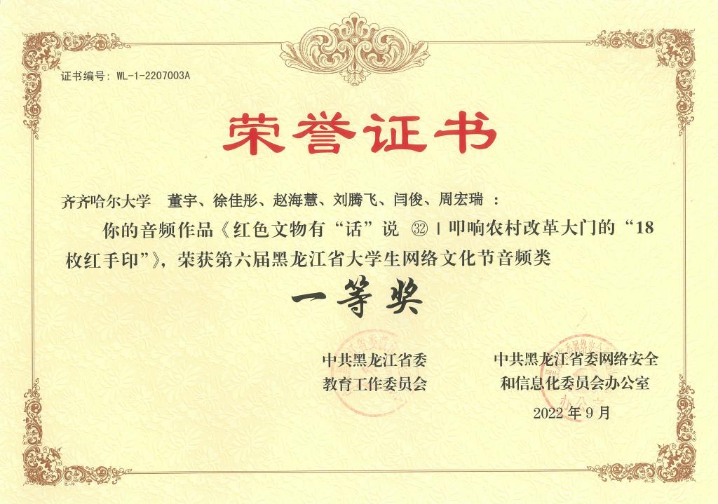 我校25项作品在第六届“全省大学生网络文化节”获奖,分别是一等奖1项,二等奖6项,三等奖18项。其中,由播主202董宇、制药201徐佳彤、工管202赵海慧、环艺201刘腾飞、计应202闫俊、机械201周宏瑞等六名同学录制的音频作品《红色文物有话说丨扣响农村改革大门的“18枚红手印”》获全省一等奖;由宣传部郭超、李昕萌老师提交的作品《听红歌· 学党史:探索新媒体时代高校思想政治教育新形势》获得“全省高校网络教育优秀作品推选展示活动”优秀工作案例二等奖。获奖作品数量和质量较前几届均有新的突破,充分展现我校在繁荣网络文化、推进高校网络思政育人工作上取得的成效。