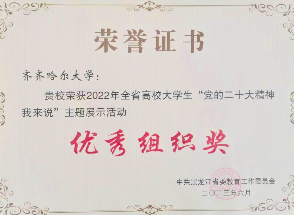 为全面贯彻党的二十大精神,切实把师生的思想统一到党的二十大精神上来,省委教育工委于2022年12月组织了全省高校大学生“党的二十大精神我来说”主题展示活动。我校积极组织学生参与,在党的二十大精神主题宣讲等4个活动内容中共获得二等奖5项、三等奖2项,学校荣获优秀组织奖。
