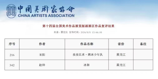 6月6日,中国美术家协会官方网站公布了“第十四届全国美术作品展览版画展区复评结果”,第十四届全国美术作品展览版画展区作品经复评评审委员会评选,共入选作品369件。黑龙江省美术工作者创作有30件版画作品入选,我校美术与艺术设计学院宋阳、赵帅两位教师的版画作品同时入选本次大展。