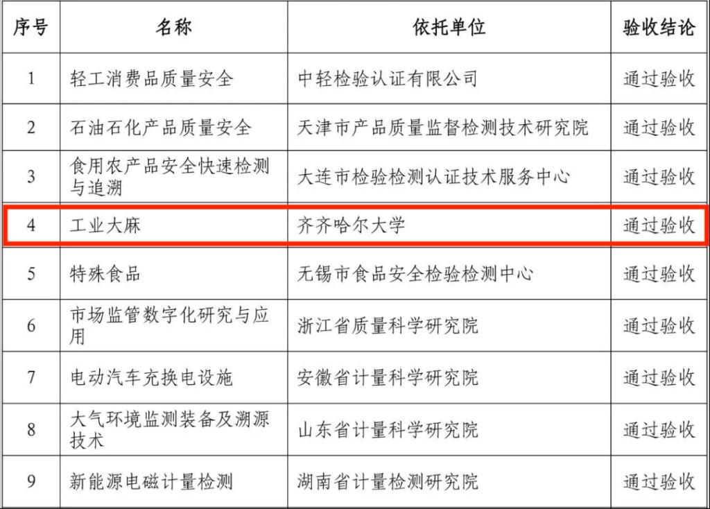 9月4日,国家市场监督管理总局正式公布了2021年批准建设的国家市场监督管理总局重点实验室和技术创新中心集中验收结果名单,我校“国家市场监督管理总局技术创新中心(工业大麻)”顺利通过验收。