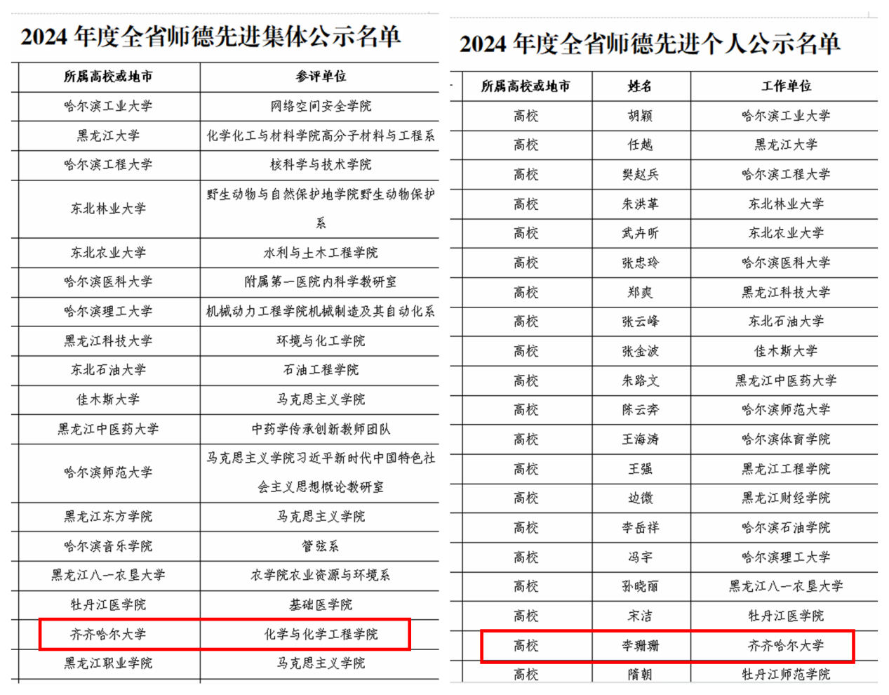 日前,黑龙江省教育厅公布了2024年度全省教育系统师德先进集体和先进个人的评选结果,我校化学与化学工程学院荣获“2024年度全省教育系统师德先进集体”荣誉称号、生命科学与农林学院李珊珊教授荣获“2024年度全省教育系统师德先进个人”荣誉称号。
