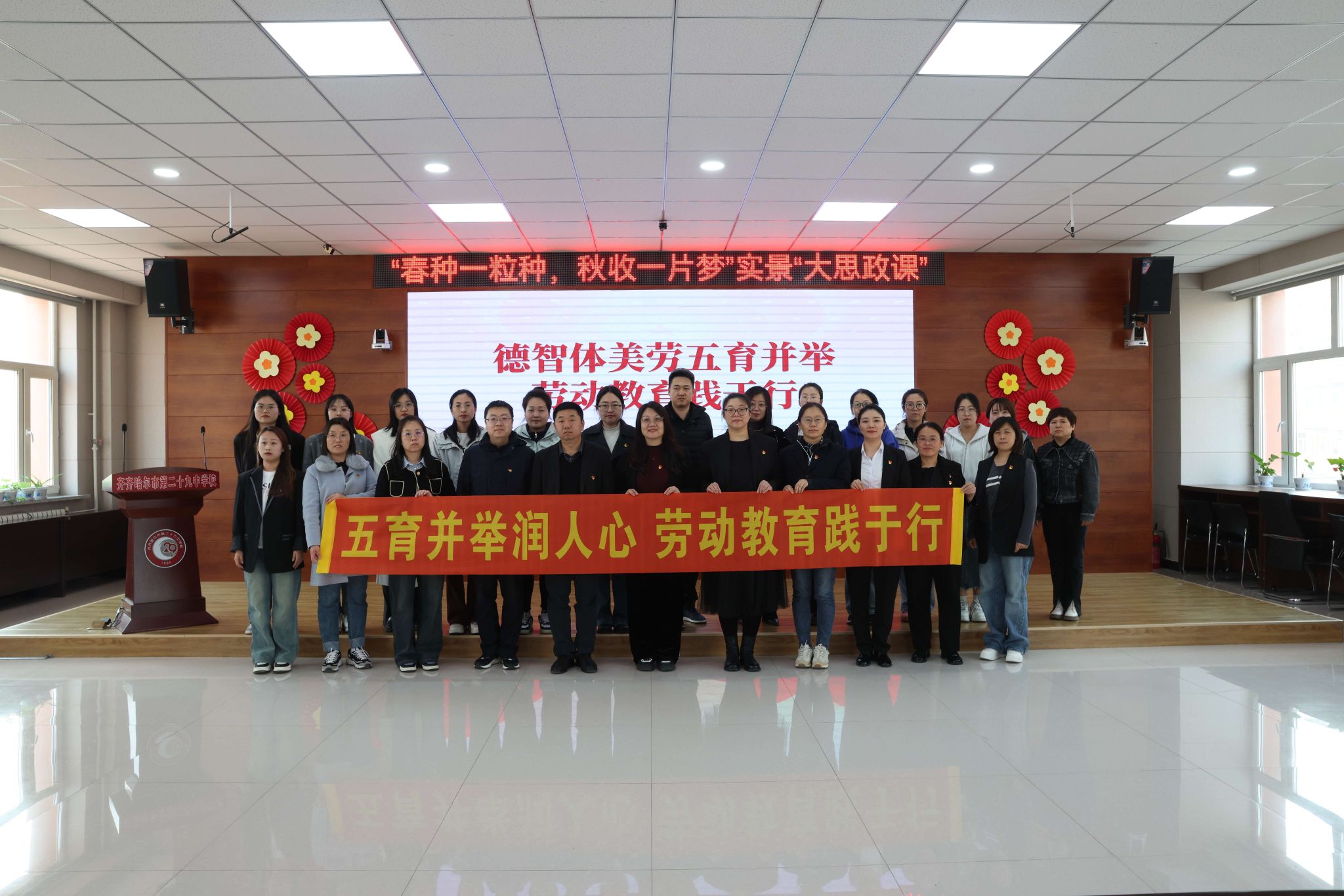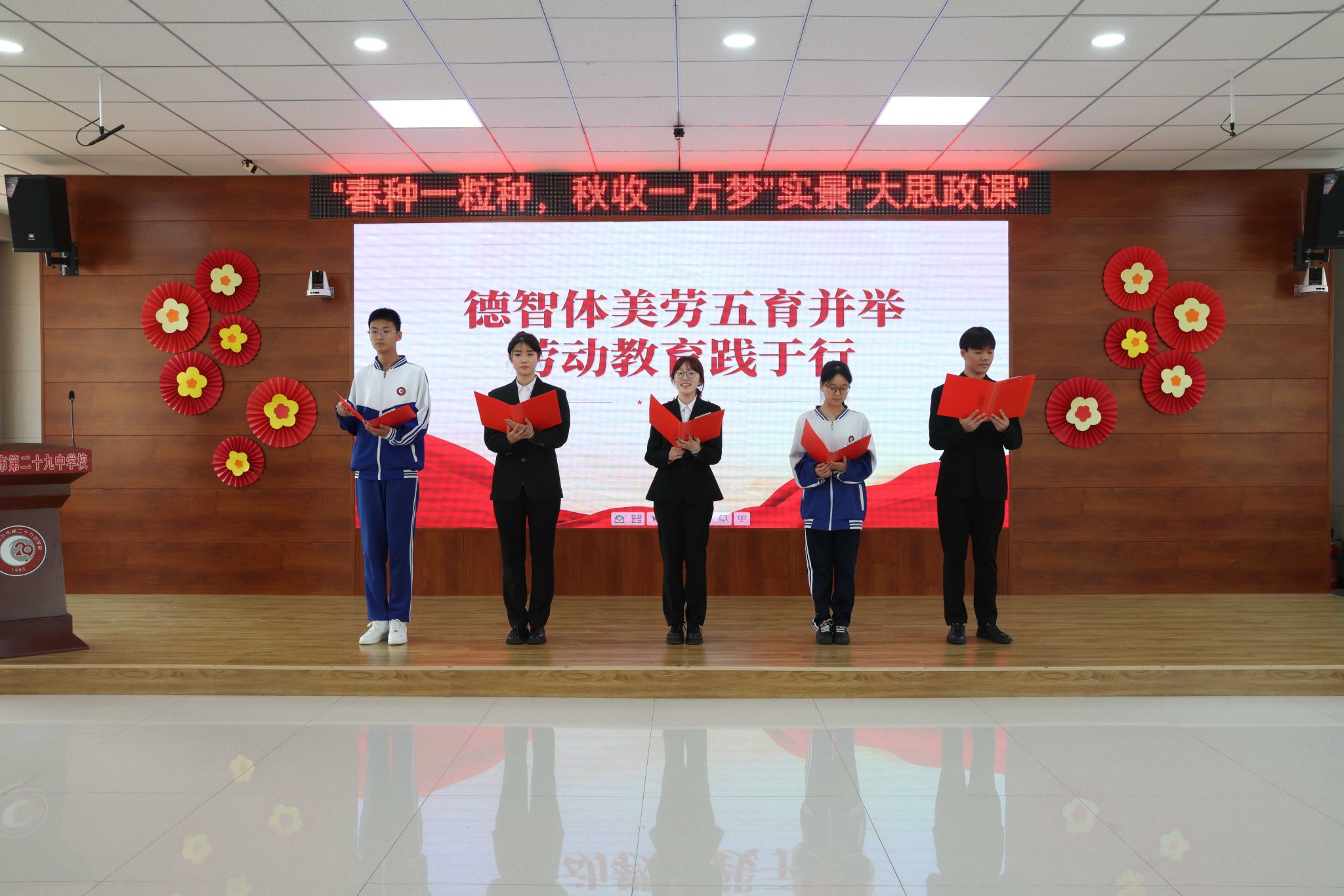签约仪式后,杨万丽以《深入贯彻习近平总书记关于劳动教育的重要论述,共筑新时代人才培养基石》为题,为师生讲党课。我校学生入党积极分子与中学生共同进行了主题为“德智体美劳五育并举,劳动教育践于行”的朗诵。