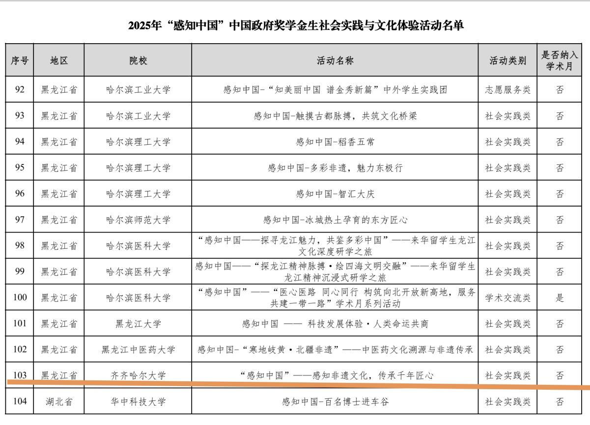 “感知中国”中国政府奖学金生社会实践与文化体验活动项目旨在为学生展示真实、立体的中国,引导留学生“读懂中国,知行合一”。我校获批的《“感知中国”——感知非遗文化,传承千年匠心》项目,通过沉浸式体验非遗与少数民族文化、中医药文化、文化创意产业、乡村振兴的深度融合,展现龙江文化的时代魅力,感悟中华文明的深厚底蕴,推动非遗文化“走”出去,增进来华留学生对中华文化的理解与认同。