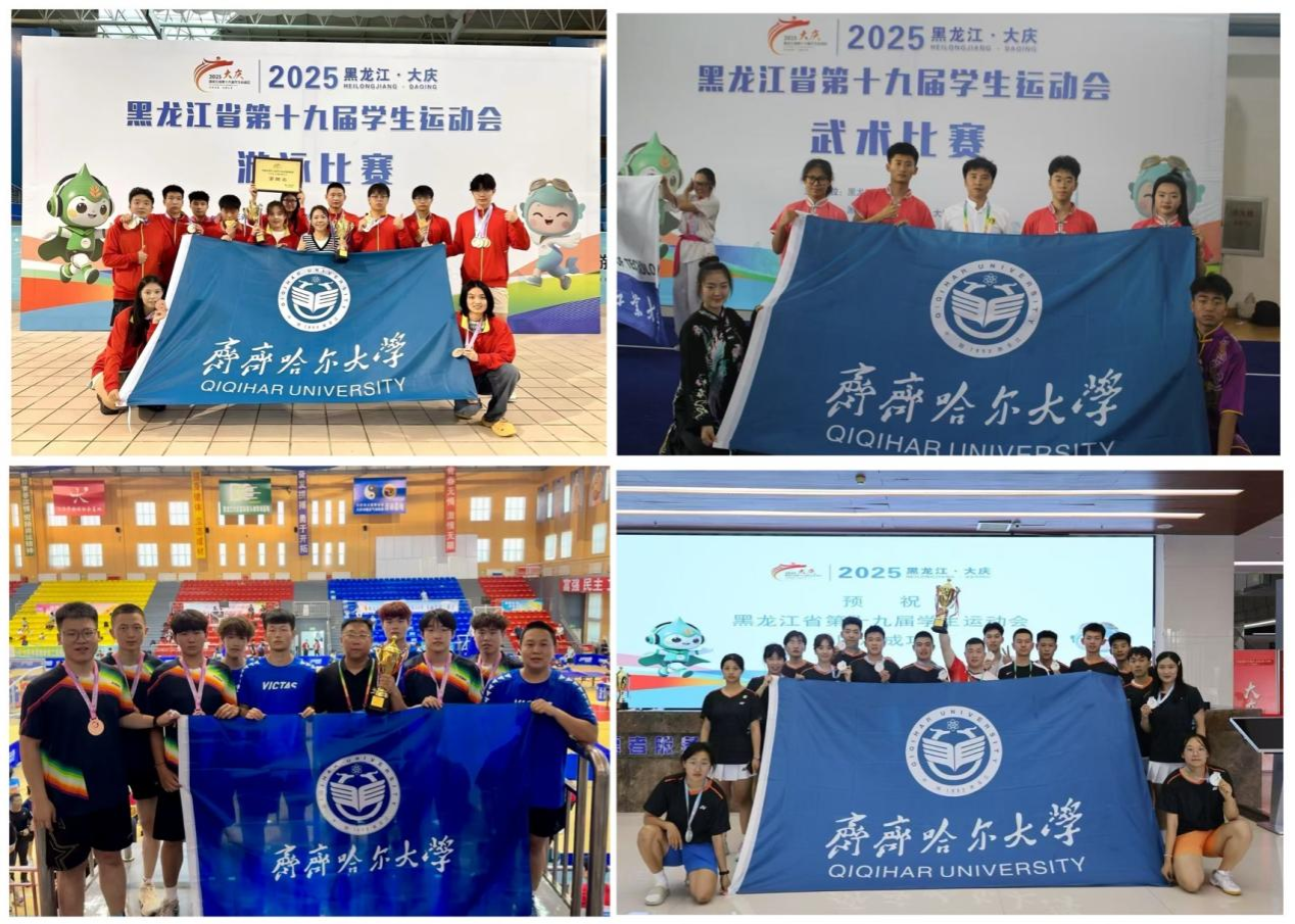7月15日至25日,黑龙江省第十九届学生运动会在大庆市举行。本届运动会设高校组、地市组两大板块,我校选派100名师生组成代表团,在游泳、武术、乒乓球、羽毛球、网球、排球、健美操、田径八个项目中展开激烈角逐。经过十天激烈比拼,我校运动员凭借出色发挥和顽强拼搏,最终获得8金、15银、18铜,总计41枚奖牌,大学乙组团体总分第三名的优异战绩。