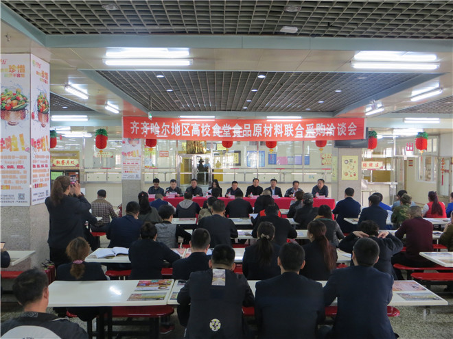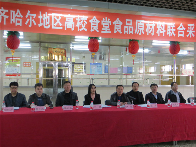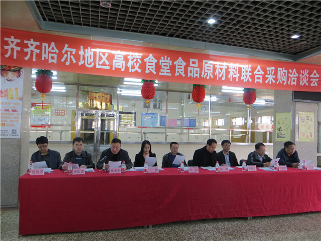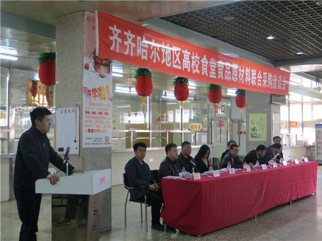 为大力推进高校食堂伙食物资准入制工作,完善可追溯源头的食品安全监管体系,有效降低食堂食品原材料采购成本,2017年4月15日上午9:00时,齐齐哈尔地区4所高校在我校学生食堂大厅召开了食品原材料联合采购洽谈会议。hg0022体育皇冠地址后勤管理处处长尹鸥、审计处处长王鸿、财务处副处长宁国祥,齐齐哈尔医学院后勤管理处处长徐辉、财务处处长黄秀义、后勤管理处副处长倪伟芳,黑龙江交通职业技术学院后勤处副处长孙文杰,齐齐哈尔高等师范专科学校餐饮中心主任杨志东等领导出席了会议。会议由hg0022体育皇冠地址后勤管理处副处长、省伙专会常委会副主任杨庆忠主持,联合采购工作组人员以及45家企业和供应商参加了会议。