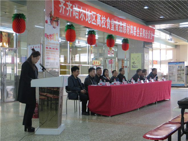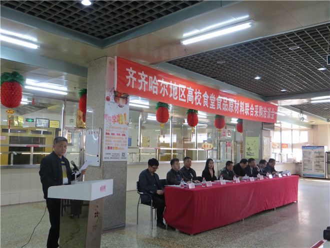 最后,我校后勤管理处处长尹鸥代表校方进行讲话。他首先感谢各高校财务、审计部门的领导利用休息时间莅临本次联合采购洽谈会议,真诚地欢迎来自辽宁省、黑龙江省哈尔滨、佳木斯以及齐齐哈尔地区的40多个商家参会。他凝练了联合采购工作呈现出的新变化:一是参与的高校不断增加,从最初的齐大、齐医等2所院校发展到现在在齐的4所高校;二是采购的范围逐步扩大,从米面油肉等大宗食品丰富到了禽类、鸡蛋、蔬菜、干调、饮料等9类食品;三是参与的商家越来越多,从开始的齐齐哈尔地区十几家增加到目前的省内外近50家;四是准入制度越来越完善,工作程序越来越严格,评议标准越来越规范。他指出,齐齐哈尔地区高校食堂大宗食品原材料联合采购工作已经开展了4年,逐步从稚嫩走向成熟,得到了省教育厅高校后勤指导中心和省伙专会的充分肯定和认可,大庆等其它地区的高校也来我校进行交流和学习。他希望,各企业和商家要一如既往的对学校教育事业给予支持,兼顾经济效益和社会效益,实现合作共赢。