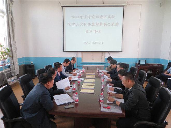 2017年5月12日,齐市地区高校食堂大宗食品原材料联合采购集中评议会议在我校后勤管理处会议室召开。hg0022体育皇冠地址后勤管理处处长尹鸥、财务处副处长宁国祥、审计处副处长刘力,齐齐哈尔医学院后勤管理处处长徐辉、副处长倪伟芳,黑龙江交通职业技术学院后勤处副处长孙文杰,齐齐哈尔高等师范专科学校餐饮中心主任杨志东等领导出席了会议。会议由hg0022体育皇冠地址后勤管理处副处长、省伙专会常委会副主任杨庆忠主持,联合采购工作组人员参加了会议。