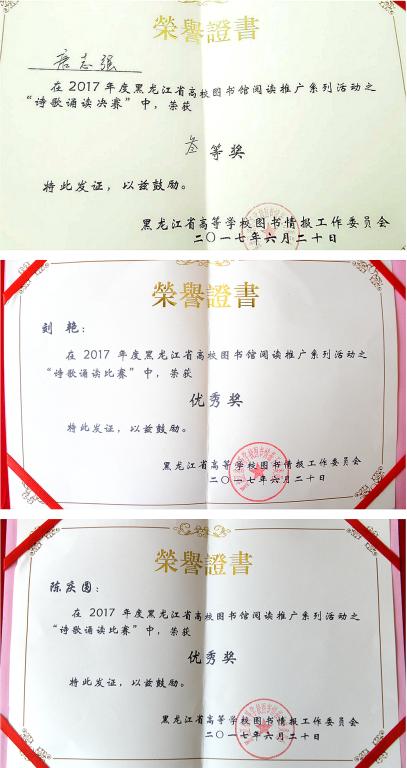我校图书馆、宣传统战部、校团委以及教育与传媒学院联合于4月26日举办了2017年读秀杯“书香校园 绽放青春”读书活动之朗诵比赛校内选拔赛,经济与管理学院唐志强同学、轻工与纺织学院的刘艳同学的以及教育与传媒学院陈庆圆同学获得了推荐资格。