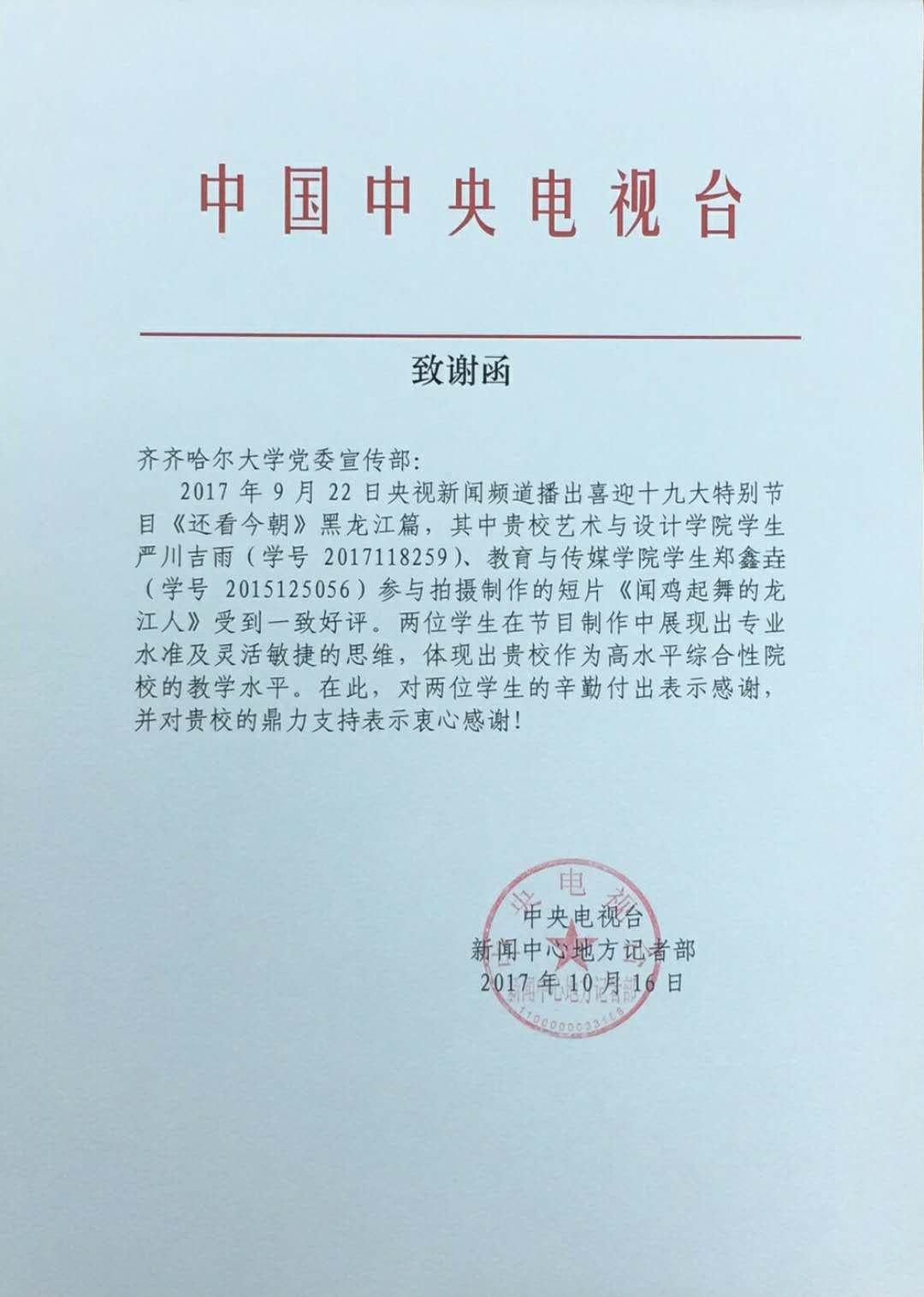 10月18日,十九大开幕式当天,齐大宣传统战部收到央视驻黑龙江记者站转来的致谢函,在函件中,对我校两名学生参与拍摄制作迎接十九大专题片《还看今朝》表示感谢,表扬“这两位学生在节目制作中展现出专业水准及灵活敏捷的思维”,体现出hg0022体育皇冠地址作为高水平综合性院校的教学水平。