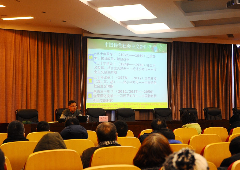 校党的十九大精神宣讲团成员、马克思主义学院中国近现代史基本问题教研部主任张春波副教授作了题为《新思想引领新时代 新使命开启新征程》的专题报告,在报告中,他从“新时代、新矛盾——进行伟大斗争”、“新理论、新思想——建设伟大工程”、“新任务、新举措——推进伟大事业”和“新使命、新征程——实现伟大梦想”等四个方面对党的十九大精神做了深入的解读。
