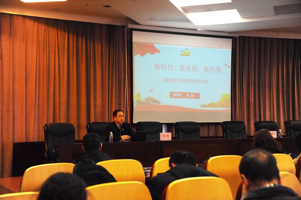 理学院党委书记韩旸以《新时代、新征程、新任务——基层党支部的职责和作用》为题,通过“数”说新时代、新征程、新任务,基层党支部的职责及作用,高校基层支部如何做好党建工作等三部分内容,详细阐述了基层党支部的职责和作用。