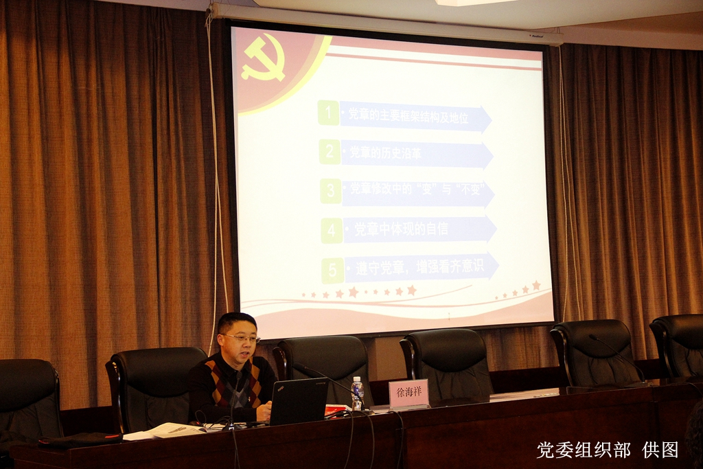 12月15日上午,党委组织部副处级组织员徐海祥在培训班上以《学习新党章 增强看齐意识》为题,从党章的主要框架结构及地位、党章的历史沿革、党章修改中的“变”与“不变”、党章中体现的自信、遵守党章,增强看齐意识等五个方面,分享了自己学习党的十九大修订的《中国共产党章程》的心得和体会。