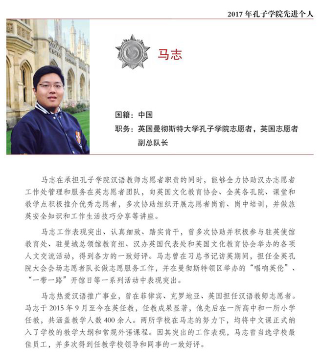 校友会在给马志和邱楠两位校友的贺信中说,欣闻你们在12月12日第十二届全球孔子学院大会上,获得孔子学院全球志愿者先进个人称号,并得到国务院副总理刘延东颁发的荣誉证书,母校师生由衷地为你感到骄傲和自豪,并对你表示最热烈的祝贺!作为齐大优秀的校友,你们为祖国赢得了声誉,为母校赢得了荣誉。你们为传播中华优秀文化贡献着青春和智慧,为助力“一带一路”建设 、“讲好中国故事”做出了积极贡献。 感谢你和所有优秀的齐大校友们!再次衷心祝贺你们,欢迎你们和广大校友常回母校看看!