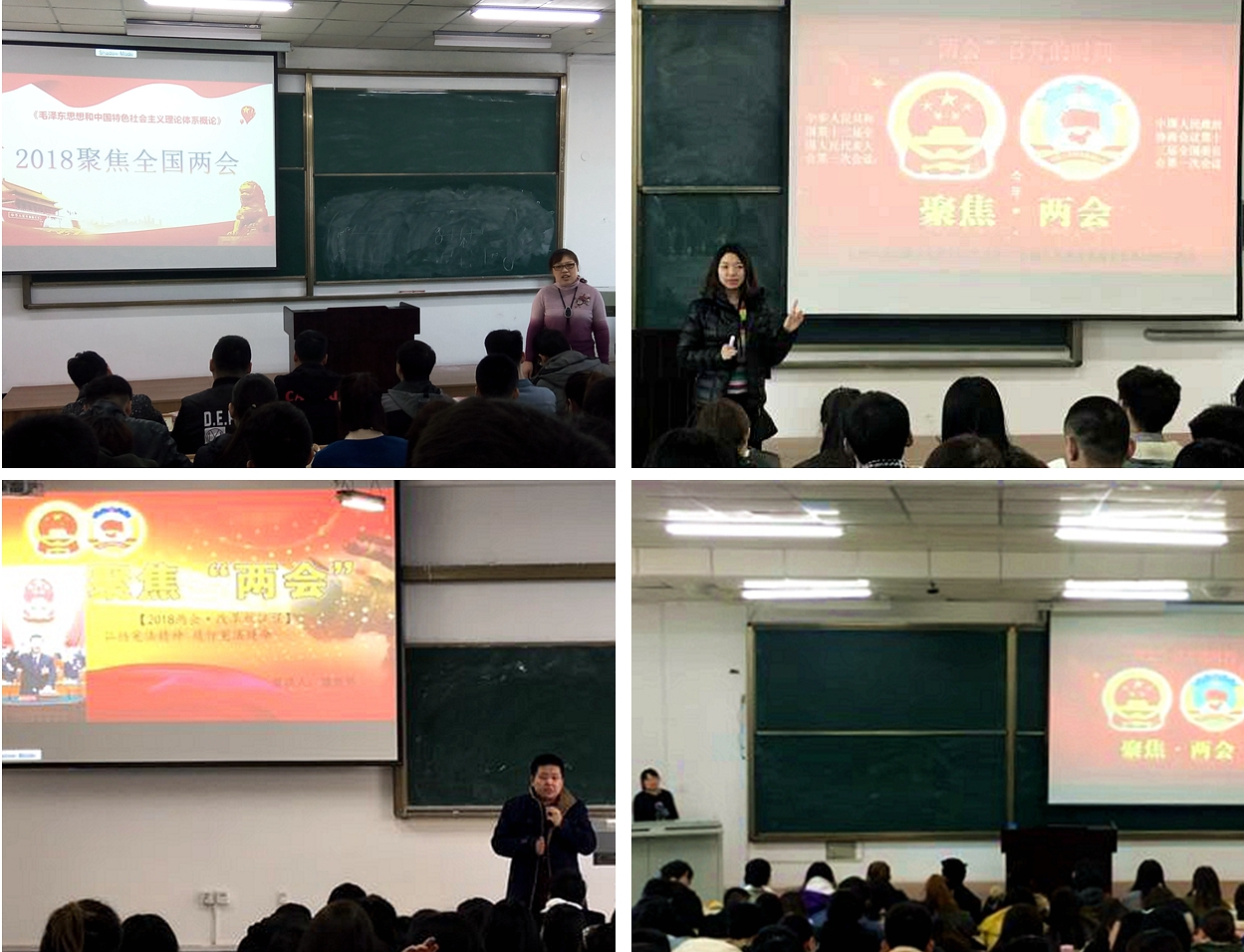 为了充分发挥思想政治理论课在大学生成长成才过程中的育人作用,增强思想政治理论课教学实效性。马克思主义学院及时把“两会”的最新内容纳入思想政治理论课课程教学内容中,实现“两会”精神进课堂,实现全方位、全过程、全覆盖育人,切实推进“两会”精神入脑入心。