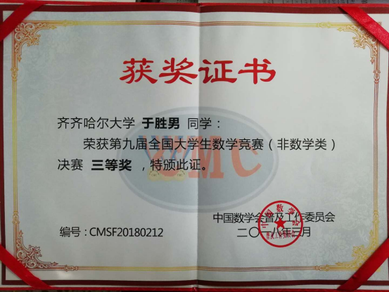 据了解,参加本次竞赛的非数学专业组有216名,是从全国29个赛区的非数学专业组85482名学生中选拔出来的,于胜男在黑龙江赛区脱颖而出,作为黑龙江赛区8名参赛学生之一参加了本次竞赛。