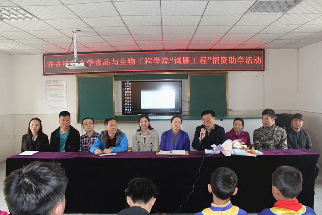 随后,食品与生物工程学院党委副书记、副院长赵振华代表学院讲话。他在讲话中说道:鸿雁工程到如今已经整整走过二十年,能够坚守二十年,这不仅是一份情,更是一份爱,更多的是我们的责任、希望与梦想。“鸿雁工程”这二十年来,正是因为有诸多像杨淳老师这样“鸿雁人”的关怀与关爱,才有了今天的枝繁叶茂、累累硕果。二十年来,由简单的书信到新时期的志愿服务,这是我们齐大食品人的创新,也是我们“鸿雁工程”的阶段性答卷,“鸿雁工程”之所以能够多年传承,与时俱进,不断发展,是我们两个学校通力合作,默契配合的结果,我们相信“鸿雁工程”还会有更多的二十年。他还对大学生和小学生们提出了两点希望:一是希望“大手”真正的走近“小手”,在“小手”们的思想引领,人生理想,价值追求,职业规划,课业辅导等方面加强指导,给予更多的关心关爱和关照,真正担负起“大手”的责任与义务;二是希望天真可爱的“小手”们,积极主动参与到活动当中来,增强与“大手”的交流与互动,快乐的健康成长,早日由“小手”成为“大手”,早日圆了“大学梦”。