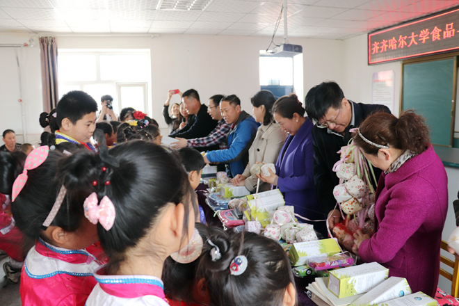 哈拉新村达族小学校长陈丽红致辞,她先向我校师生的到来表示欢迎,并由衷地感谢我校师生多年来对哈拉达小学一如既往的关心、爱护、温暖和帮助,尤其是对杨淳老师这二十余年来的辛勤付出与默默坚守表示由衷的敬意和感谢。“鸿雁工程”走过20年,已经从最初的“雏雁”成长为羽翼渐丰的“大雁”,这只“大雁”不仅包含了人员队伍的不断壮大,活动内容的逐渐丰富,活动内涵的不断提升,更多的还是新老“鸿雁人”心手相牵结下的浓情厚意。如今,“鸿雁工程”桃李芬芳,香飘各地,大手牵小手,爱心频传递,令“鸿雁人”骄傲与欣慰。“鸿雁工程”创立至今已经有400多名学生受益于齐大食品学院的关爱与帮助,带着食品学院师生的温暖和心意,小学生们一定会一路砥砺前行,奋力向前。陈校长细数鸿雁过往,感恩齐大食品学院,还诚挚的邀请我院师生常到哈拉达小学做客,共同感受鸿雁之美好。