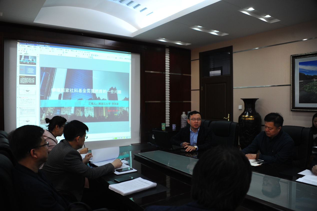 报告会上,李洪波教授从五个方面阐释了关于申报国家社科基金项目需要把握的问题:一是国家社科基金评审流程及立项率;二是黑龙江大学申报国家社科基金的做法及经验;三国家社科基金申报的选题及注意事项;四是关于申报书填写的有关技巧;五是文科科研顶层设计、谋划措施及繁荣计划。