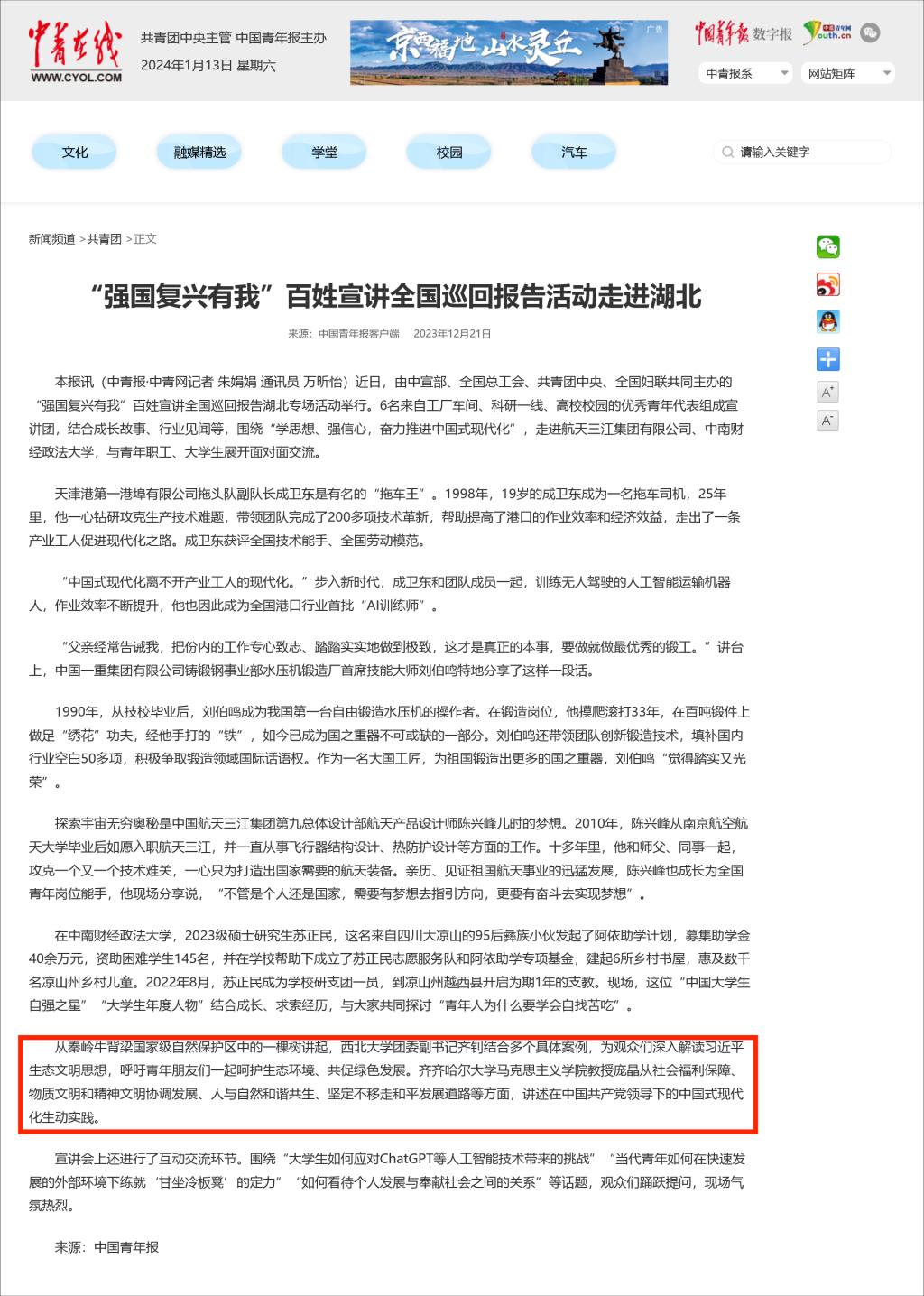 【中青在线】“强国复兴有我”百姓宣讲全国巡回报告活动走进湖北