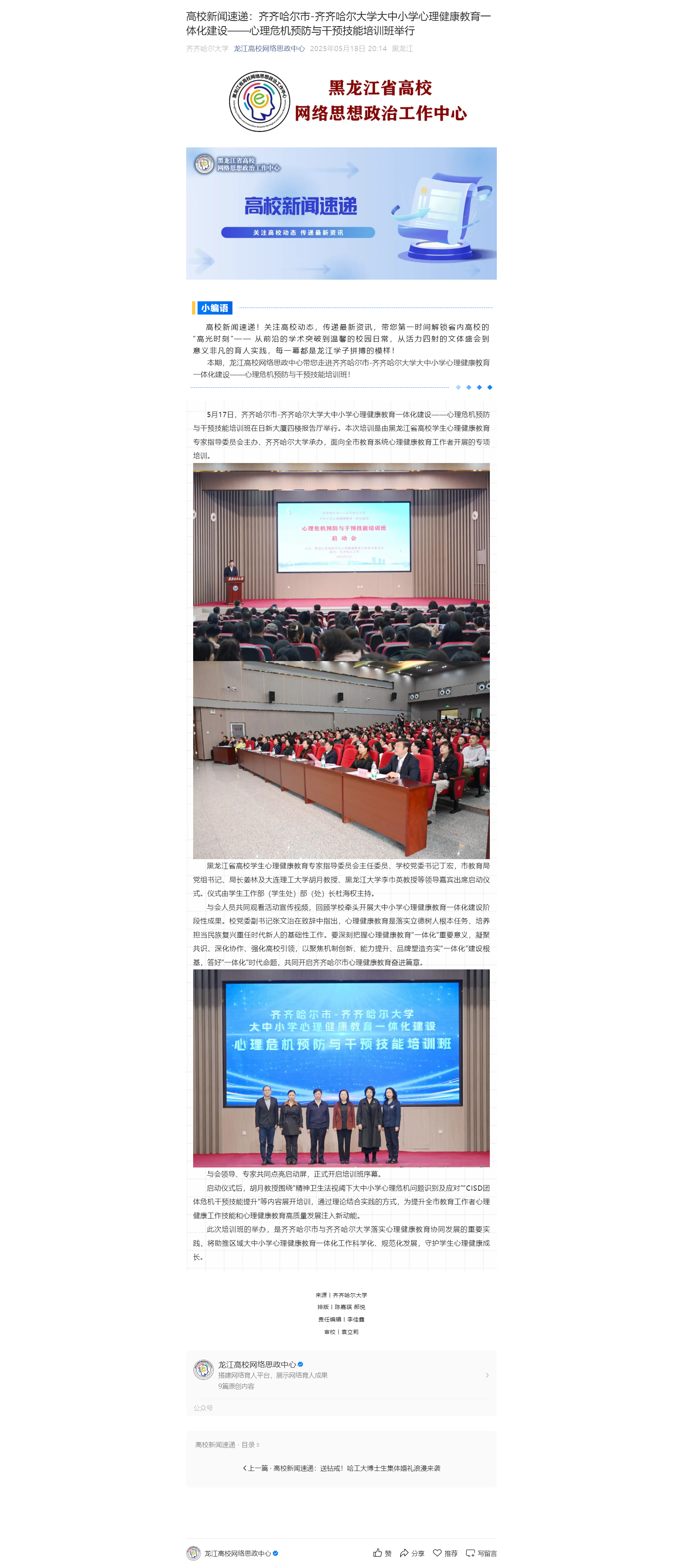 【龙江高校网络思政中心】高校新闻速递:齐齐哈尔市-hg0022体育皇冠地址大中小学心理健康教育一体化建设——心理危机预防与干预技能培训班举行