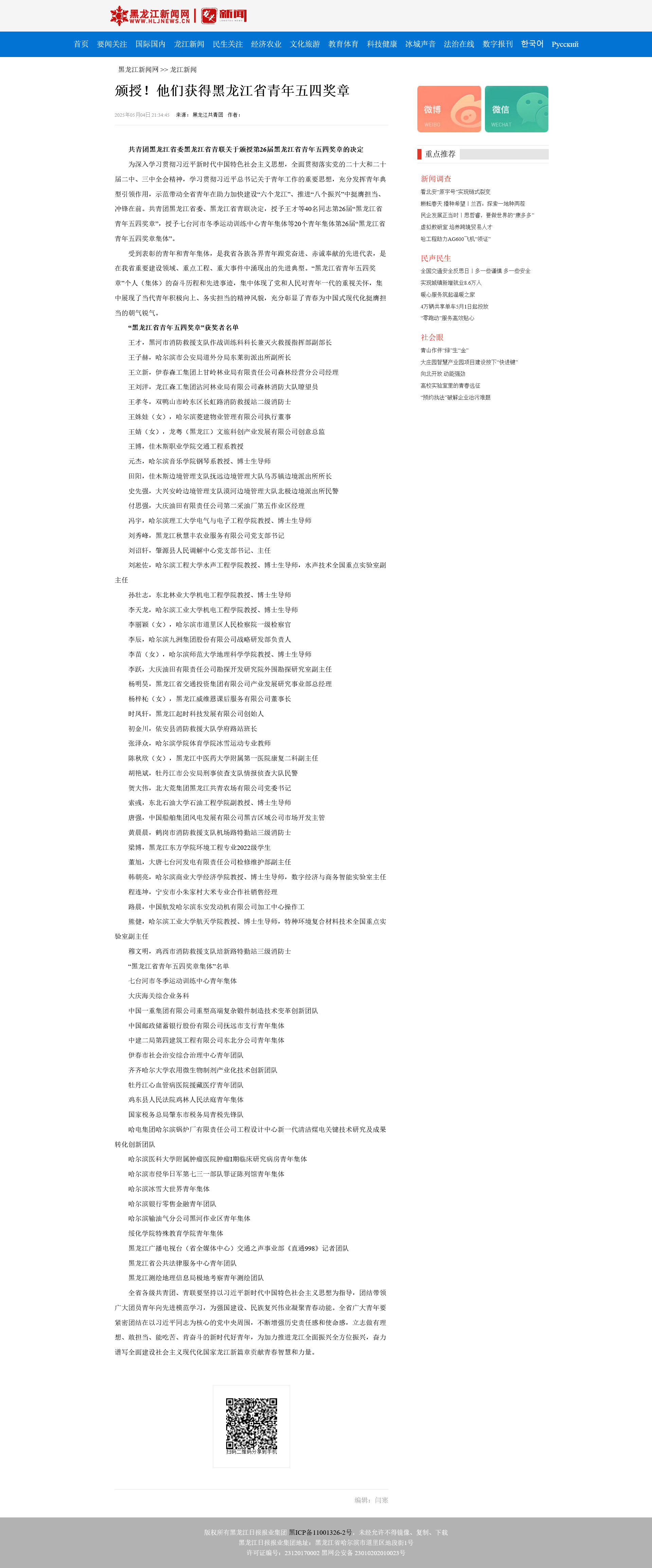 【黑龙江新闻网】颁授!他们获得黑龙江省青年五四奖章