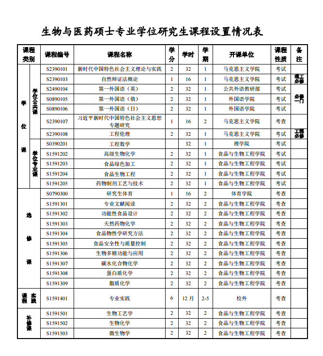 课程设臵见食品科学与工程学科学术学位硕士研究生课程设臵情况表。食品科学与工程学科学术学位硕士研究生修读课程总学分应不低于30学分,其中学位公共课9学分,学位专业课10学分,选修课9学分,实践环节2学分。
